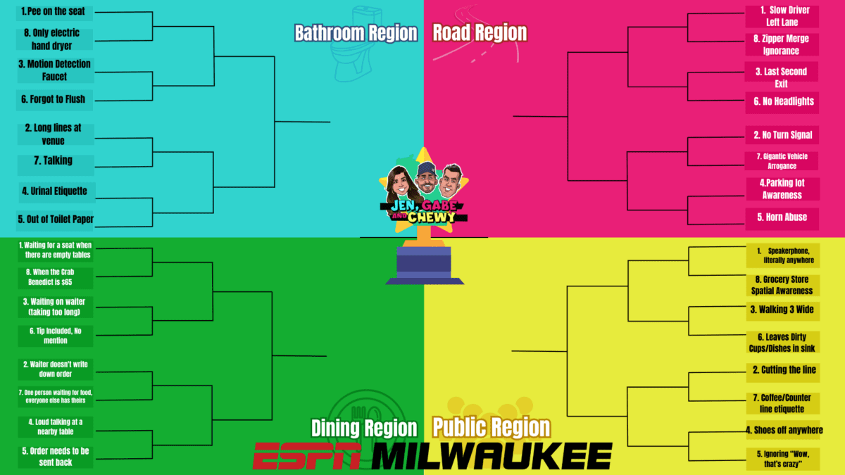 WKTI 94.5 ESPN Milwaukee’s Jen, Gabe and Chewy are giving away a Jen, Gabe and Chewy branded sweatshirt and an ESPN Milwaukee prize pack on April 8, 2024. Fans may enter by being one of the first 32 listeners to text “JGC” into the ESPN Milwaukee Talk and Text line (1-800-990-3776) on Thursday, March 21, 2024, when prompted during Jen, Gabe and Chewy beginning at 7:00AM CST and ending at 9:00AM CST. The first thirty-two (32) people to text into the ESPN Milwaukee Talk and Text line will be randomly one of the “grievances” previously selected and ranked by Jen, Gabe and Chewy. Each day, the grievances will be posted as a poll on x.com (formerly Twitter) where fans can vote for the most annoying grievance. The most voted on grievance in each matchup will move on to the next round until there are just two (2) teams remaining in the championship matchup. The winner who was randomly selected to the grievance that ‘wins’ the bracket will win the grand prize. There will be a total of one (1) grand prize in the contest. The total ARV of the Grand Prize is $75.00.