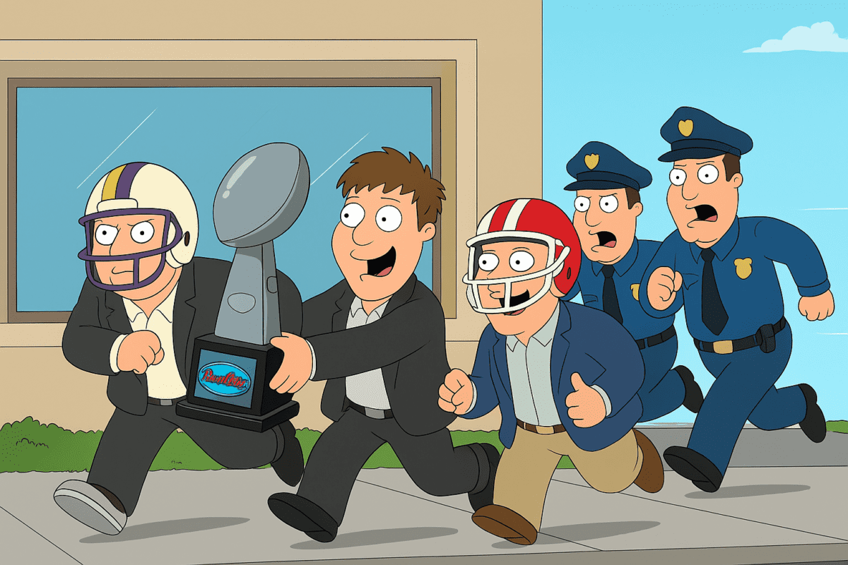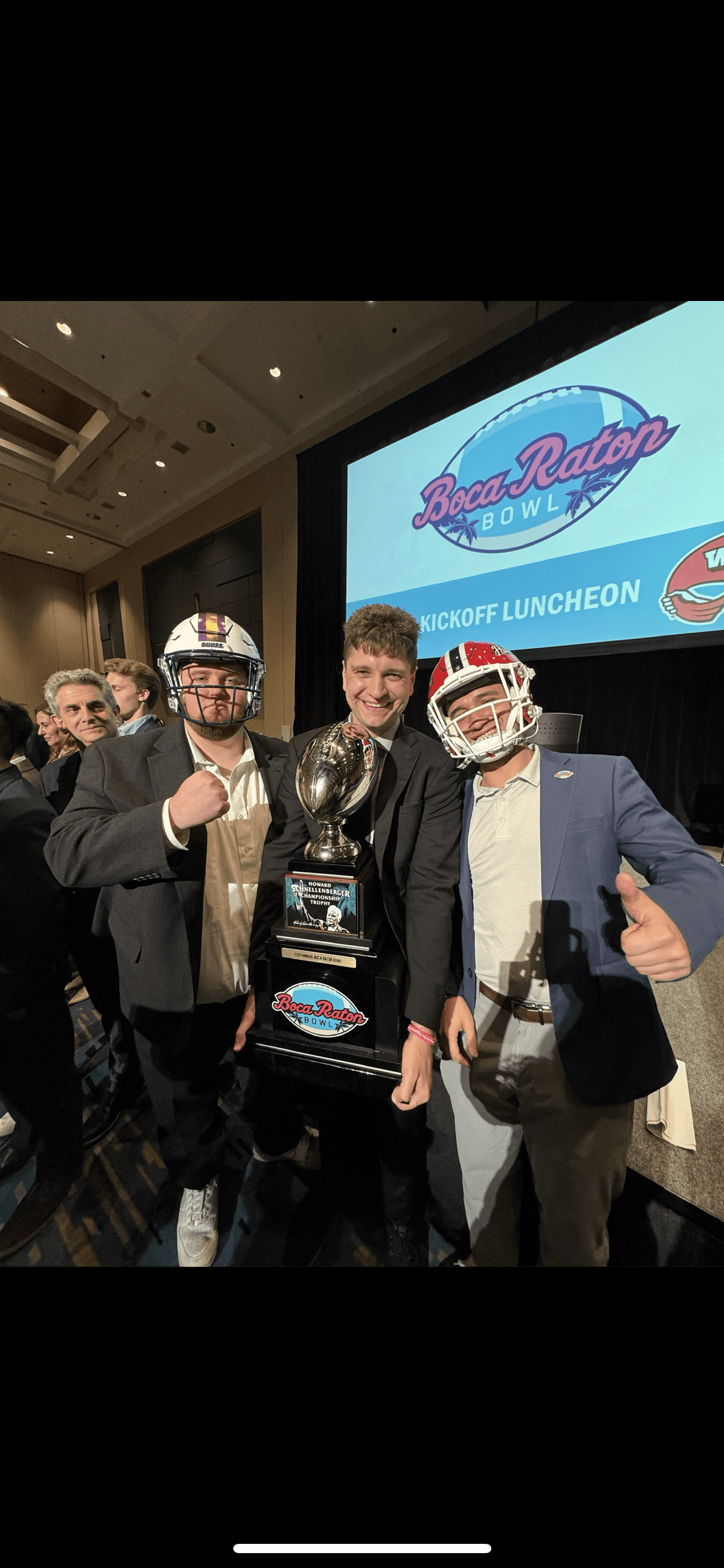 Mondo, Mike Rizzo, and Lukas Rubio crash the Boca Raton Bowl luncheon to steal the trophy and helmets. They are still on the run from the cops to this day….